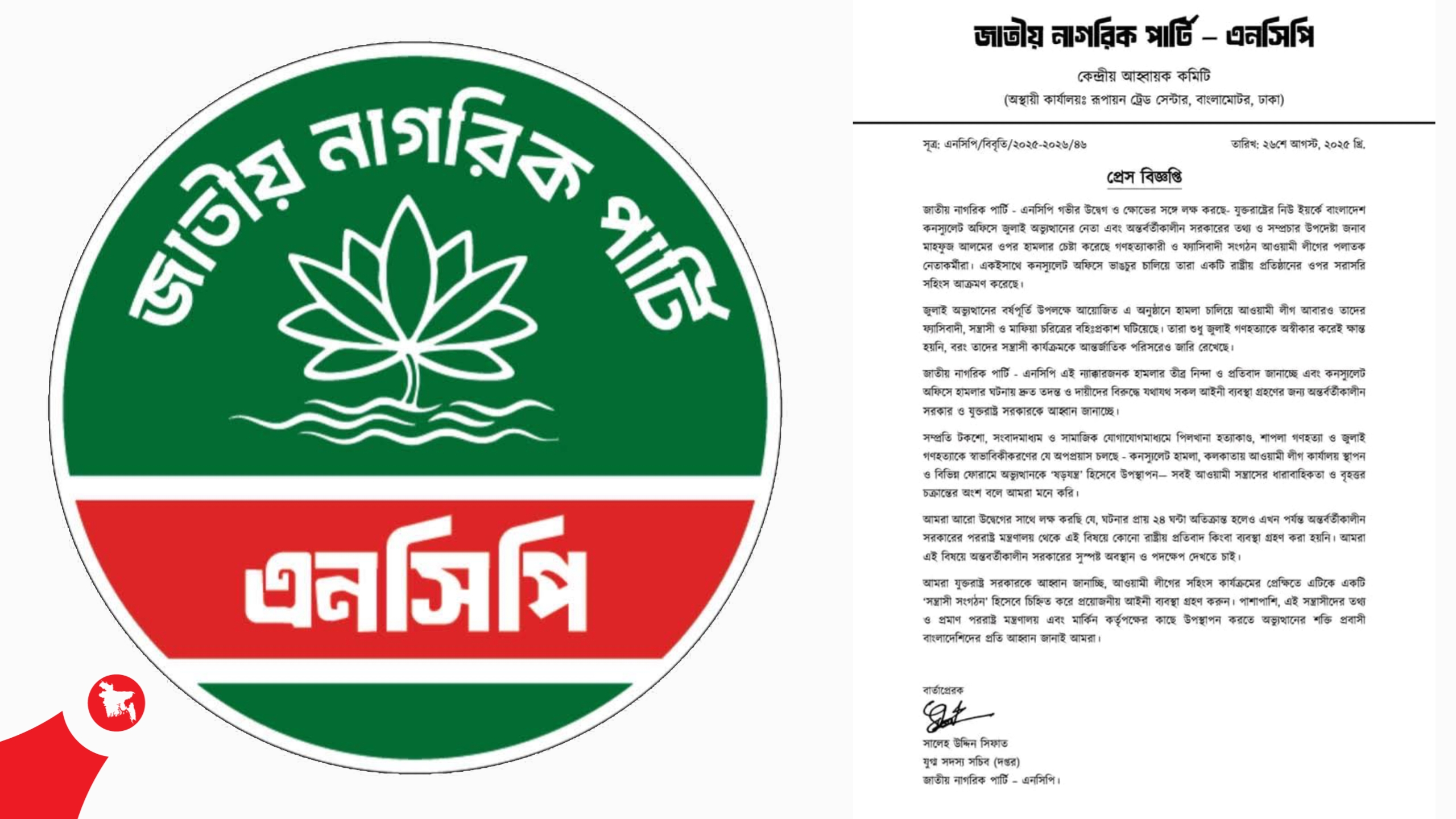 জাতীয় নাগরিক পার্টি–এনসিপি এক প্রেস বিজ্ঞপ্তিতে জানিয়েছে, তারা গভীর উদ্বেগ ও ক্ষোভের সঙ্গে লক্ষ করছে— যুক্তরাষ্ট্রের নিউ ইয়র্কে বাংলাদেশ