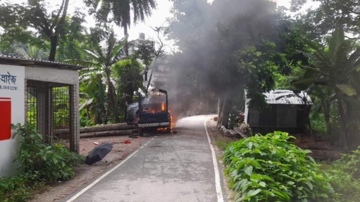 এনসিপির জুলাই পদযাত্রাকে কেন্দ্র করে গোপালগঞ্জে পুলিশের গাড়িতে আগুন ছাত্রলীগের